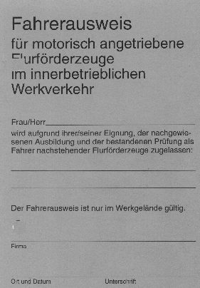 Fahrerlaubnis Die Fahrerlaubnis für Flurförderzeuge berechtigt eine Person zum selbständigen Steuern des Fahrzeuges.