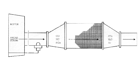 KatalysatorBei Flurförderzeugen mit Benzinmotor wird ein Katalysator (Trockenabgasreiniger) eingesetzt, um die giftigen Schadstoffe (Kohlenmonoxid, Kohlenwasserstoff und Stickstoffoxide), die beim Verbrennungsprozeß im Motor entstehen, in den Abgasen durch Nachverbrennung zu reduzieren. Bei der Nachverbrennung der Abgase wird heute vorwiegend der sogenannte Dreiwege-Katalysator eingesetzt, der alle drei Schadstoffe zur gleichen Zeit entsprechend vermindert. Der Katalysator ist innerhalb des Auspuffsystems in einem Metallgehäuse untergebracht. |