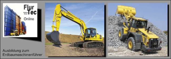 Beschreibung Ausbildungsziel: Erdbaumaschinenführer Geräte-Typen: Hydraulikbagger, Lader Nach den Grundlagen: BetrSichV, BGV A1, BGR 500 Kapt. 2.12, VBG 40 Theoretische Ausbildung: Abschluß mit schriftlicher Prüfung Praktische Ausbildung: Nach der Unterweisung auf einer aktiven Baustelle mit dem Ausbilder Unterrichtseinheiten: 40 UE - beinhaltet 10 UE praktische Ausbildung pro Teilnehmer auf den Geräten Basiskurs Dauer: 5 Tage Vollzeit